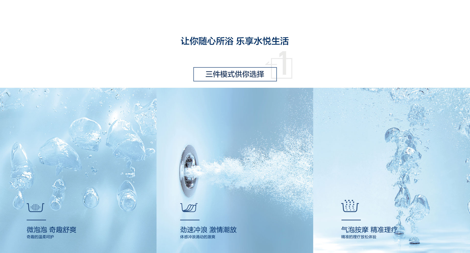 勁速沖浪按摩系統、微泡泡按摩系統及汽泡按摩系統三件模式供你選擇,讓你隨心所浴,樂享水悅生活